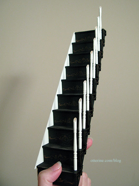 I used 1/16″ thick basswood sheet to make the stringer, tracing the outline of the stairs flush with the back and lower front. I added a little extra to the top to trim the stairs. I painted the visible part of the stringer Vintage White by Folk Art and the back edge black.