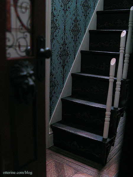 The stairs are still removable at this point, because I need to be able to work on the railing and newel posts. Oh, hello, Ophelia. :D