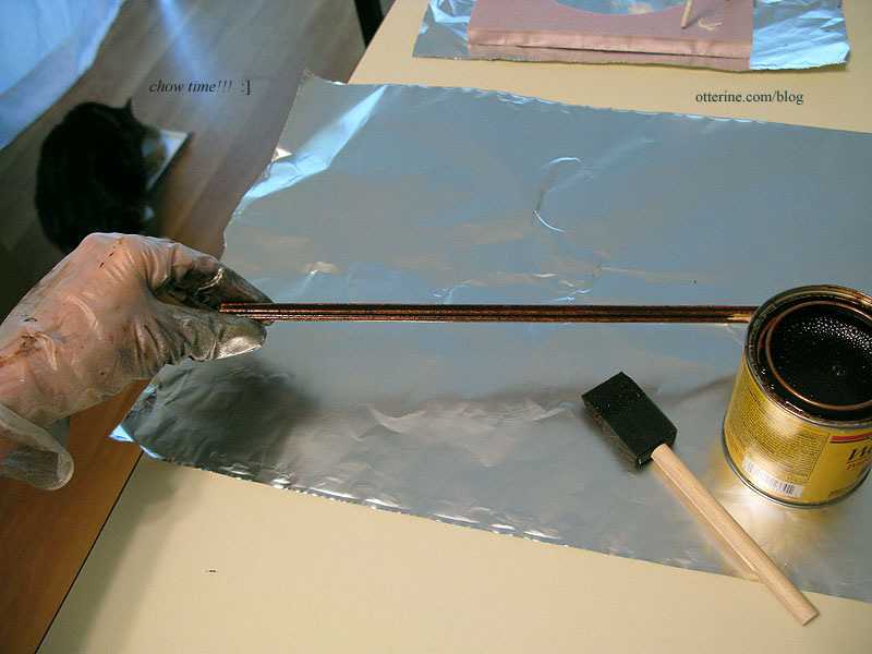 When I stain or spray paint, I use a rubber glove to hold the piece (or the board with the pieces taped on). Saves me from soaking up chemicals through my skin, and there’s no clean-up involved. These gloves usually last through many applications, so I just set them aside to dry until next time.