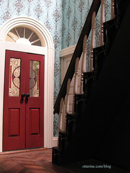 Continuing work on the interior staircase. When I cut the balcony and the adjacent stair opening, I left enough room to add a stringer. This completes the look of the baseboard trim up the staircase and addresses the slight warp in the pocket door wall that the stairs follow.