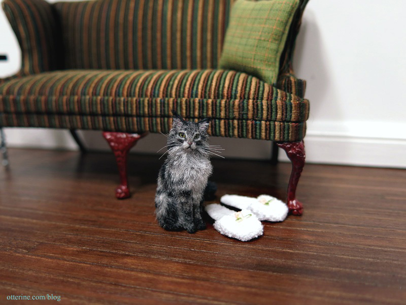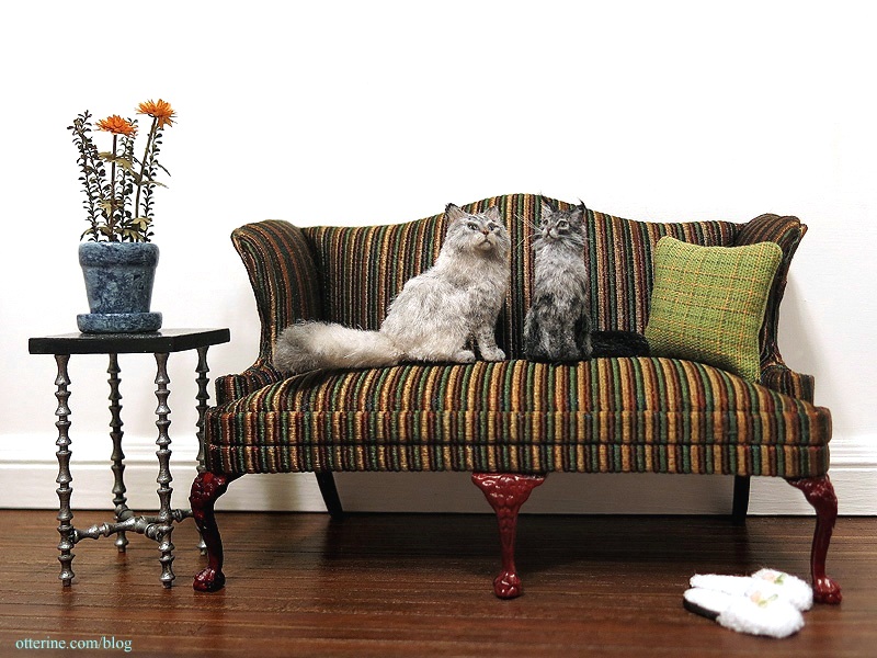 Isabeau is slightly smaller than the other cats I have when shown in comparison, like Ophelia here, but they both fit perfectly in 1:12 scale. :]