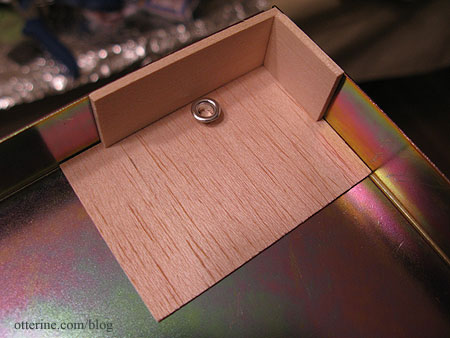 I first measured and cut the vertical pieces to fit inside the opening in the cabinet. I then glued them onto a thin sheet of balsa using a jig. Before enclosing the box, I used a metal sewing eyelet to punch a hole for a drain.