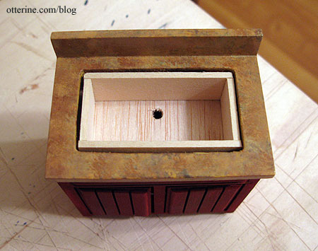 Once the basic box was dry, I cut the balsa base to fit and drilled a hole in the base cabinet to match up with the drain.