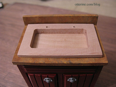 The hole in the top of the cabinet for the sink was deep, so there was plenty of room to add a deeper sink. My attempts at making a sink out of polymer clay were lumpy and rather sad. So, I built one out of 1/8″ basswood and balsa.