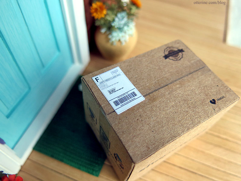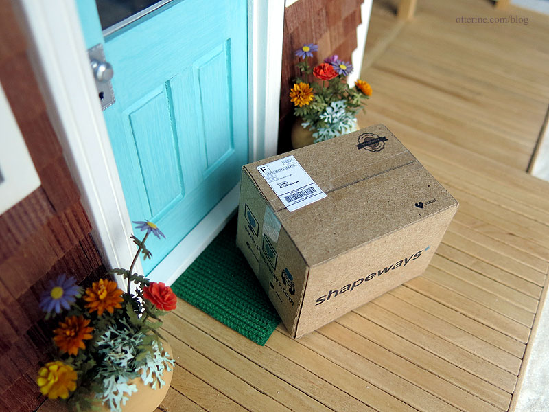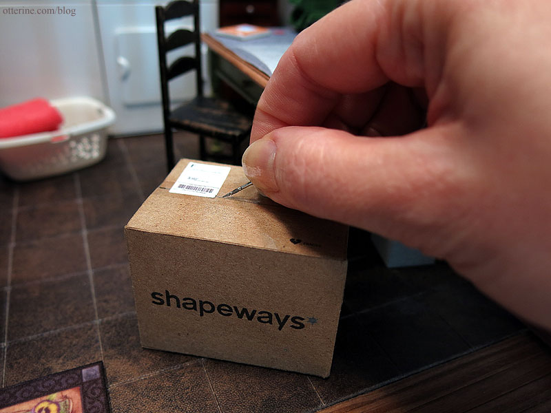 Open the box to find Shapeways 3D printed items wrapped in thin foam (many thanks to Peggy for the foam supply). Maybe one of these days I’ll figure out how to make bubble wrap in 1:12 scale. I did at least include tiny pieces of masking tape to hold the foam secure. :D