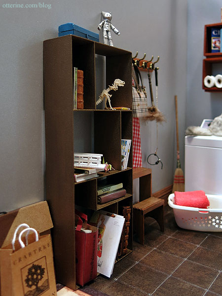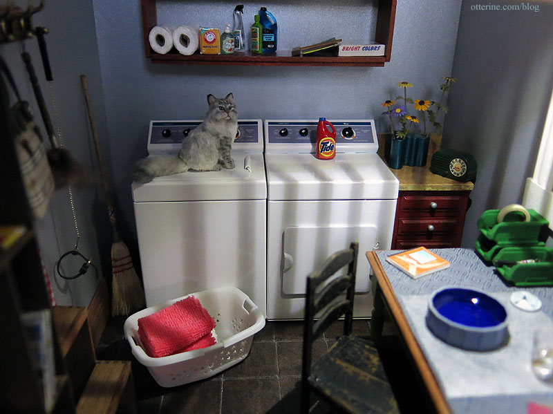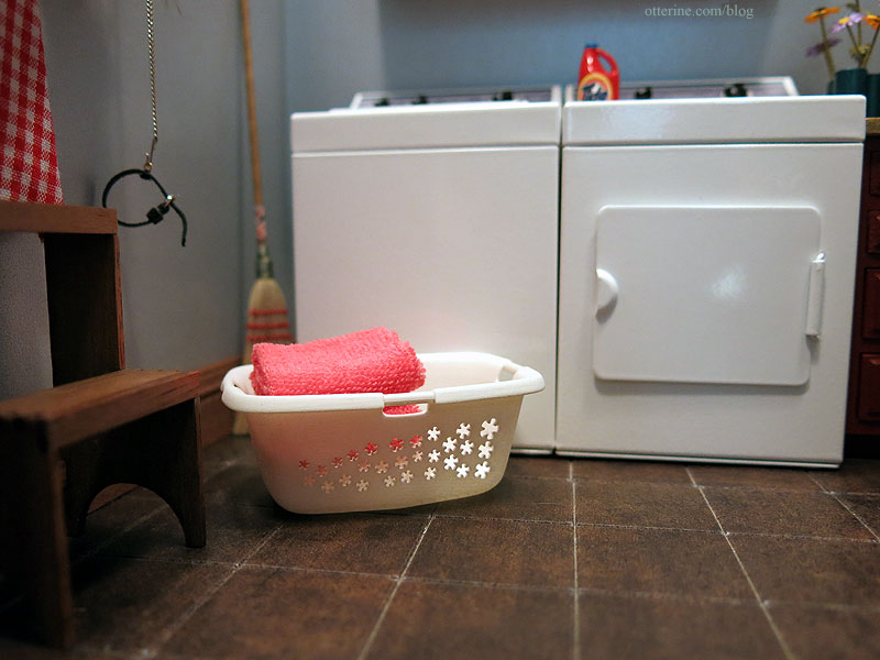 My mini craft room is also the laundry room. This beautiful washer and dryer set from Barbara are accented by a wonderfully detailed 3D printed laundry basket by MarionRussek. I spray painted it flat white.