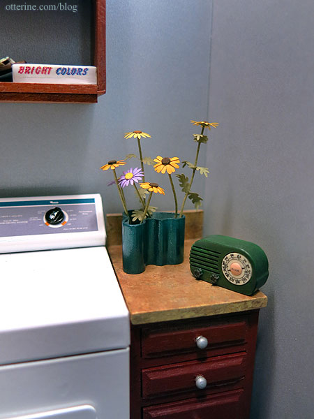 The modern vase is from modernminifan and was molded in white. I painted it Testors Gloss Teal, a gorgeous metallic blue green.