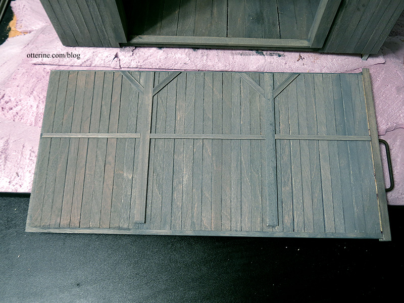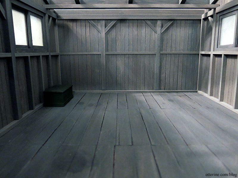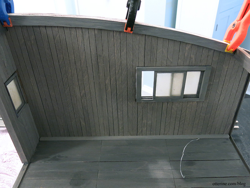For the removable back wall, the floor trim is glued to the floor but not to the back wall and the top trim is glued to the channel that holds the sliding wall. The faux beam trim is thin and glued to the wall but doesn’t interfere with the functionality.