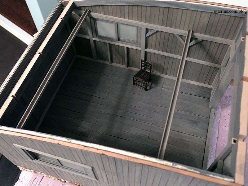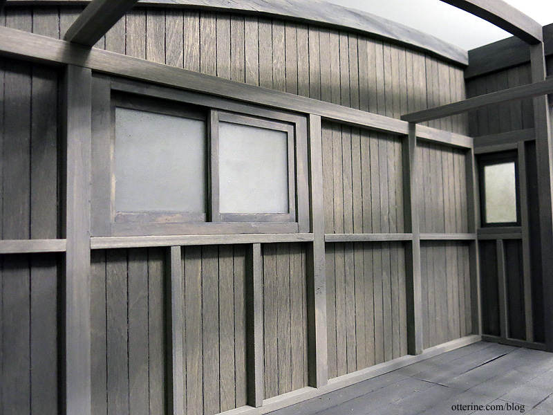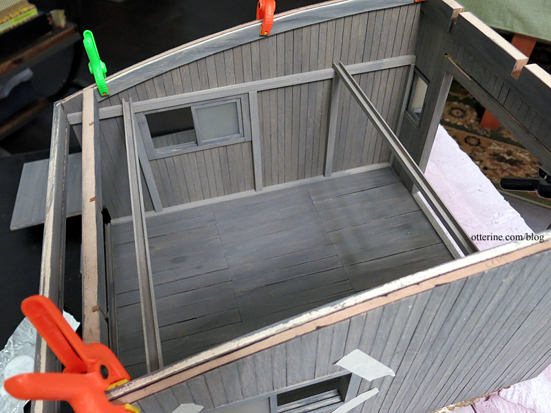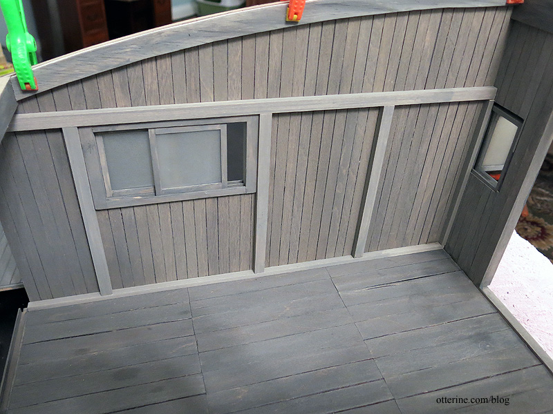 To finish the upper part of the back wall, I just added a piece of strip wood instead of making tiny siding boards. The curved ceiling beams will remain removable until I am ready to put on the roof.