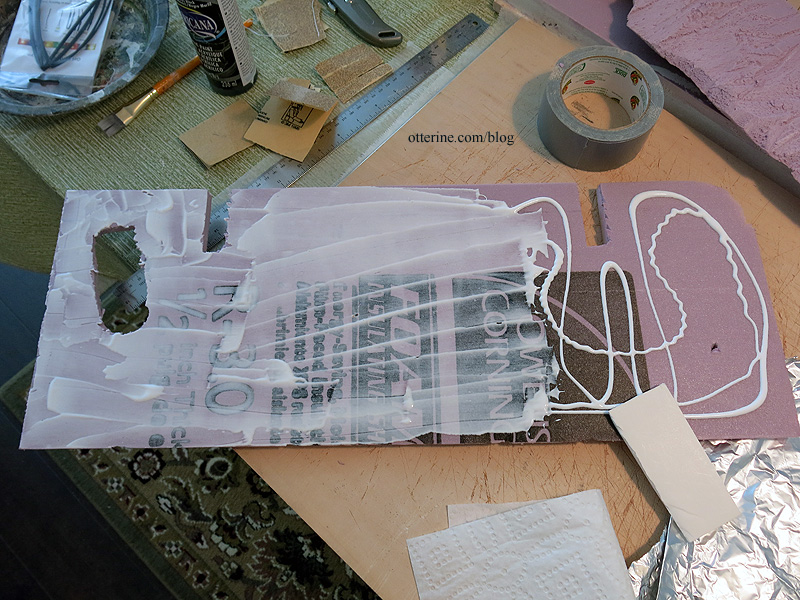 I glued the front lower foam piece to the landscaping board using Weldbond glue. I applied glue to the foam with a scrap of foam core board and then pressed it into place.