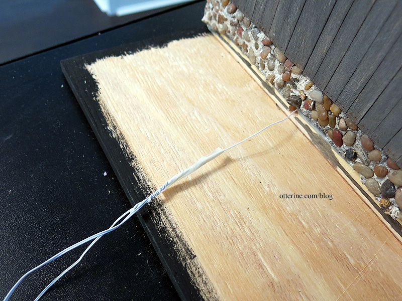 I used my floral lead wire that I had installed when I glued the floor board to pull one final wire and one scrap wire through the hole. Once those were through, I taped the final wire to hold it in place and used the scrap wire to bring another final wire and the floral wire back through the hole. I used the floral wire to bring one final wire back through. Why not do them all at once? For some reason, it never fits. I end up with the same amount of wire through the hole at any given time, but it never wants to budge. :D