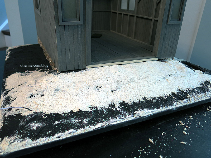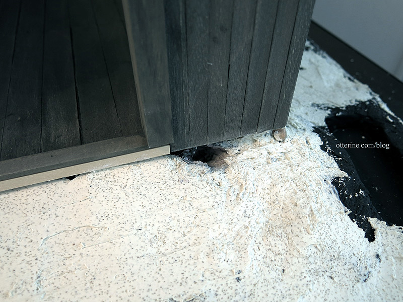 Once dry, I painted them with a mix of black and brown. I won’t bother touching up the base trim until I’m done with the landscaping prep work. I glued the remaining pieces of foam in place.