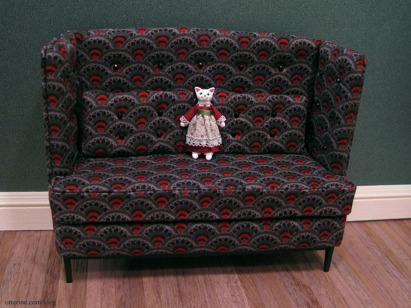 Jen bought one of the cutest kitty dolls I had ever seen from PamelaJunkMinis on etsy, and the Heritage absolutely begged for one of its own. Pam made one custom for me since I just wasn’t sure about working on such a tiny doll but I knew what colors and fabrics I wanted. Miss Kitty is simply stunning in person with pretty green eyes to match her sash. I love her!