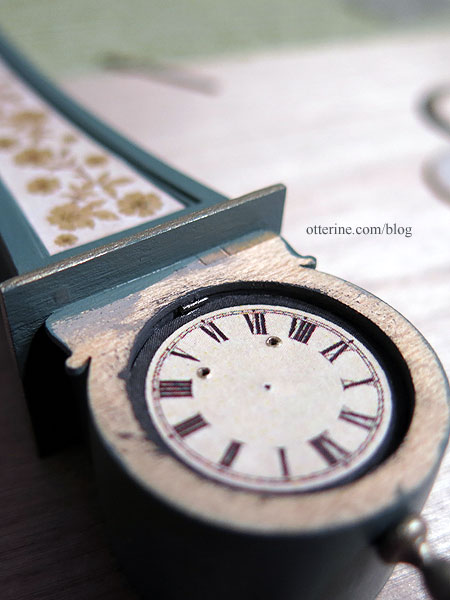 A dear blog reader suggested the face didn’t look right, and I thought it was just me who felt that way – or because the hands weren’t on yet. So, I decided to print two more versions with smaller dials. You’ll see this revised face for the rest of the build. Instead of digging out the pasted face, I just added another cardstock circle to bring it forward a bit more and pasted the new face over the top. I applied a thin layer of Delta Ceramcoat Satin Varnish as a sealer for the paper face and previously applied artwork adapted from The Graphics Fairy.