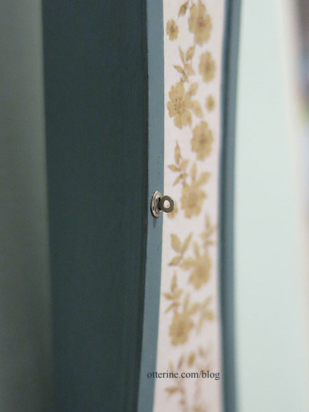 There’s a small nail for the knob. I dabbed these with Taupe Metallic by Folk Art to match the other detailing. Since the hinges don’t function, the paint won’t matter. Now it looks like you can open the glass to wind the clock.