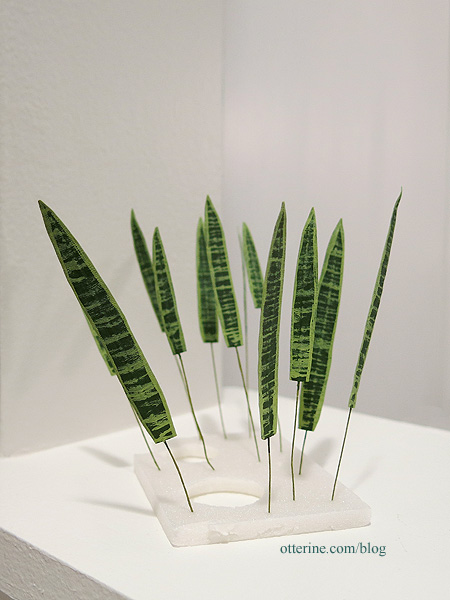 I made a smaller snake plant back in 2011. I used the technique found in a book on making miniature plants out of florist tape called Miniature House Plants by Ruth Hanke. In the book example, while the author did include painting the rough stripes of the plant, she didn’t include the wide light green outer edges so I added those based on the real deal. :D I then sealed the leaves with Delta Ceramcoat Satin Varnish.