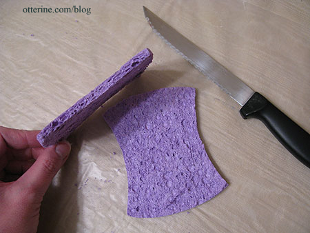 Using the overall real life dimensions as a guide, I started cutting the sponges into thinner pieces. I used the curved sponge to make the arms of the sofa, cutting it into thinner sections using a serrated kitchen knife. It was rather like cutting really stale bread. :D
