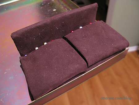 For the upholstery, I chose chocolate brown micro suede. I’ve been sewing for a long time, but this was my first time upholstering…mini or otherwise. It took me quite some time to figure out the best way to get the fabric on the sponge and wood frame. I sewed some, glued some…swore some. :]
