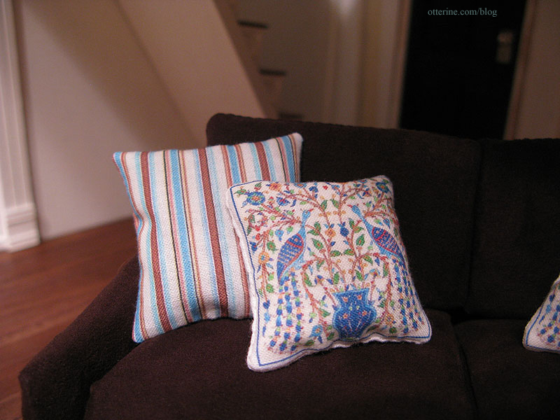 The striped pillows were created by finding designs online, resizing in PhotoShop and printing on fabric. The bird pillows are actually made from a resized image of tiles by Jerusalem Pottery, which I then printed on fabric.