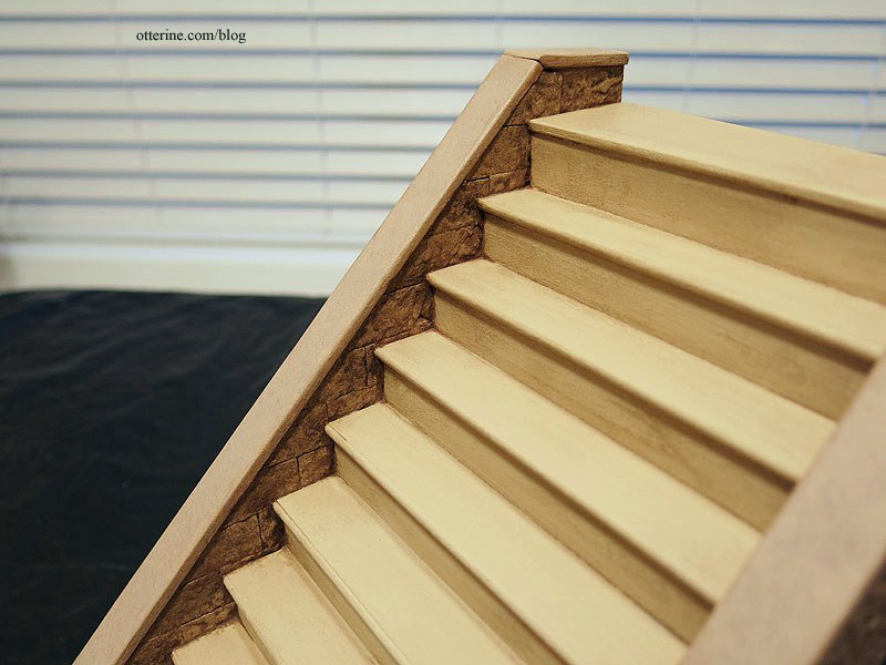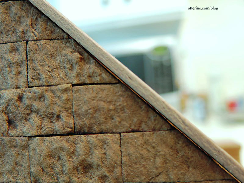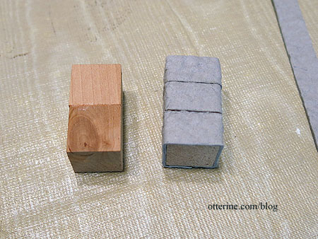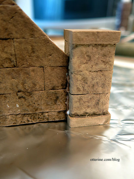 I glued two 3/4″ wood blocks together to make each pedestal to finish the front edges of the stone walls, adding long strips of 1/2″ wide egg carton material around them.
