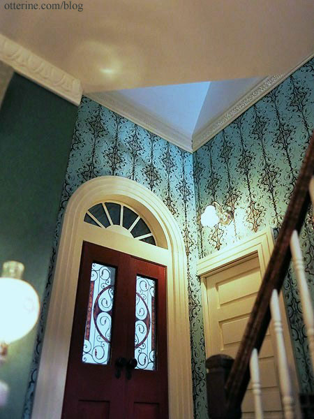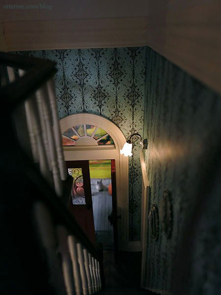 I glued the foyer light in place with the bulb facing downward. With the light on, the bulb would be distractingly bright when viewed through the open stairwell. I can still reach the fixture to remove the shade and change the bulb as needed. It’s just enough illumination without looking out of place.