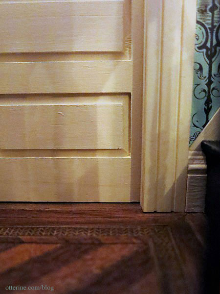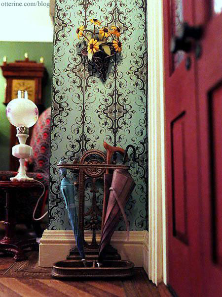 Adjacent to the front door is the working pocket door that leads to the kitchen. The beautiful umbrella is from FranMadeMinis.