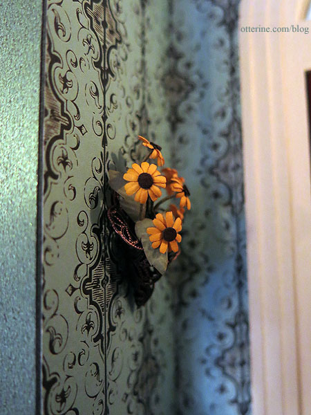 The wall vase is a cornucopia shaped jewelry finding with Bonnie Lavish flowers. Any artwork added to this side wall would have been hard to see, so I thought a three-dimensional piece would suit the space best.