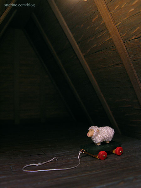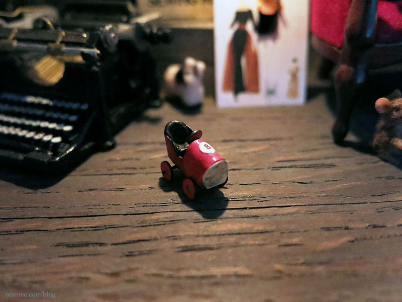The wood and brass toy train was in a miniatures lot I bought on craigslist. It’s very well made, and the wheels turn. It actually rolls around along the uneven attic floor.