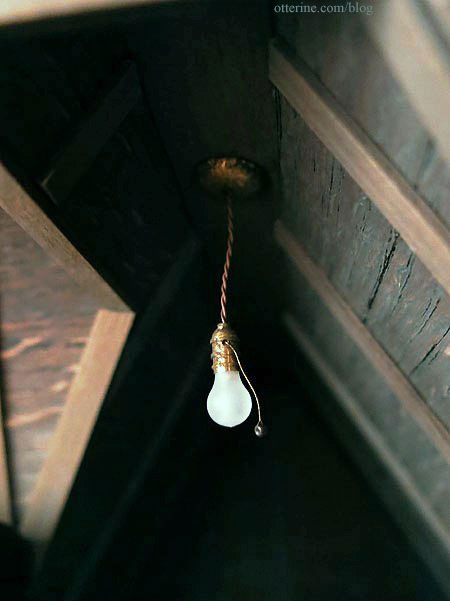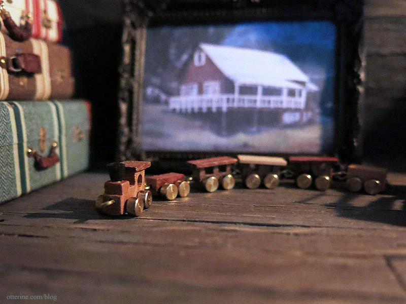 This lovely painting is a miniature reproduction of one created by my dear friend Lyssa. This is here in the attic only for holding. It will be proudly displayed in a future house. The wood and brass toy train was in a miniatures lot I bought on craigslist. It’s very well made, and the wheels turn. It actually rolls around along the uneven attic floor.