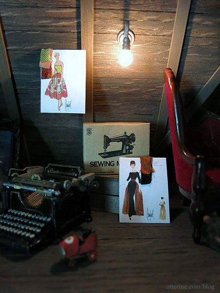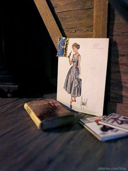 The red vintage sofa is one of my favorite pieces, but I couldn’t imagine making a whole room around it. It fits perfectly in the attic. Lyssa sent me the Summer Sisters book, a miniature of the one she lent me to read. Marion sent me the most adorable plush sea otter that she made!!! :D He’s so well made and soft, standing at 2 7/8″ tall. He’s poseable, too!