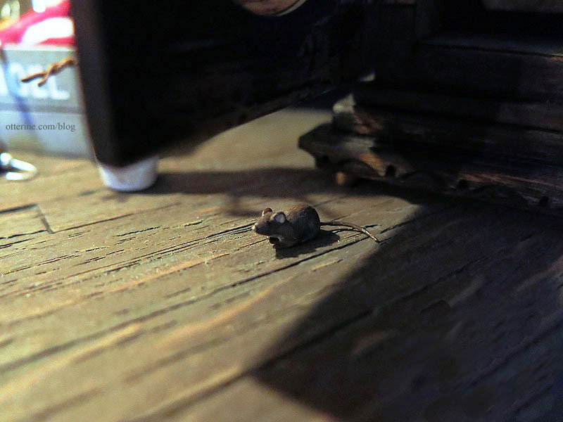 Glenda sold a few of her fine artisan miniatures that she didn’t end up using in her projects, and I offered a new home to an adorable little mouse made by Kristy of Mini Menagerie. Kristy stopped making mini animals, and I was sad that I might never be able to have one of her creations for my own. Thanks to Glenda, I was able to add this one to my collection along with the lovely green rug Glenda sent along with him. Here he is holding a spinning top from CW Lubin, though he came with a strawberry.