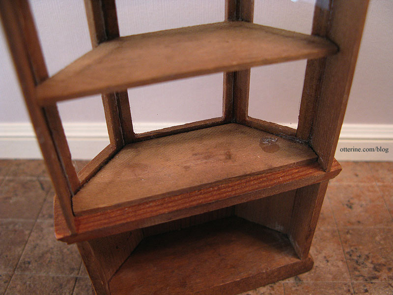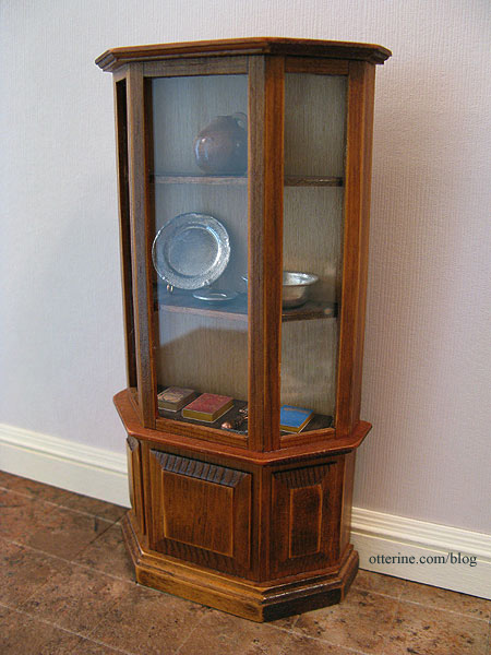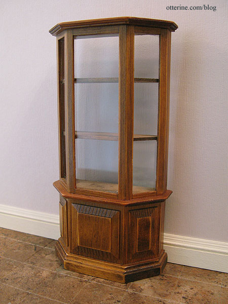 I was going to build a display cabinet, but with the projects still to be completed and the due date in just over a month, I started looking around for something ready-made. I stumbled across this vintage curio cabinet on etsy at Vintage Calico Garden. Perfect!