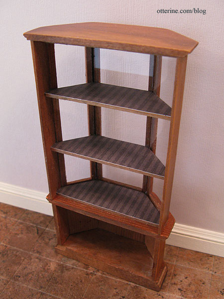 Heather helped me by sending some scraps of paper for the Heritage bedroom, and she included some coordinating dark striped paper in the package. I used this striped paper to make liners for the shelves. I colored the edges for the top two shelves with a marker (not seen here), because the white paper edges would have shown through the front and side glass panels.