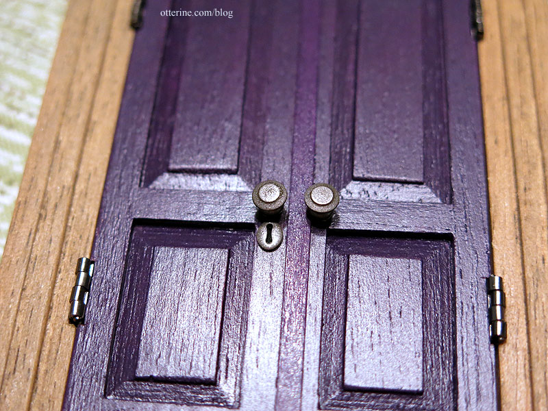 Continuing work on the door and windows. I spray painted four doorknobs and two keyholes in antique bronze since the area for door handles was so narrow. I had to put the knobs a little off center from one another due to the draft strip down the middle.