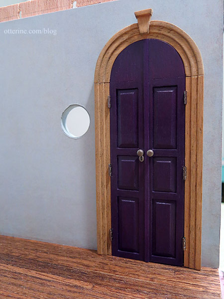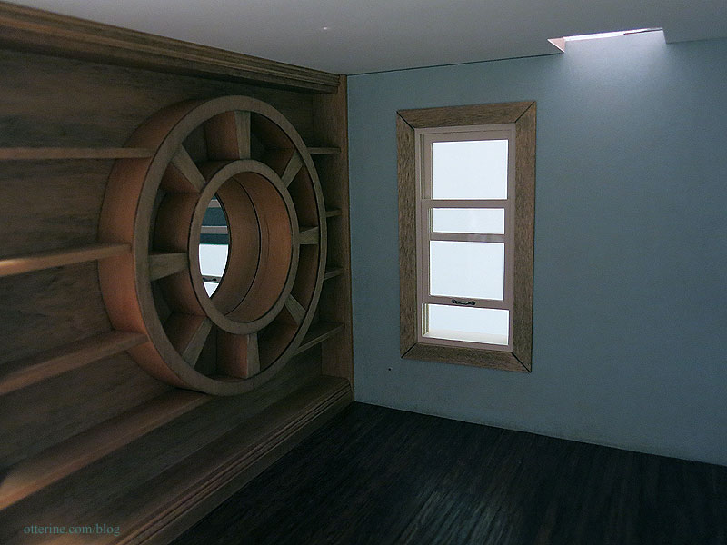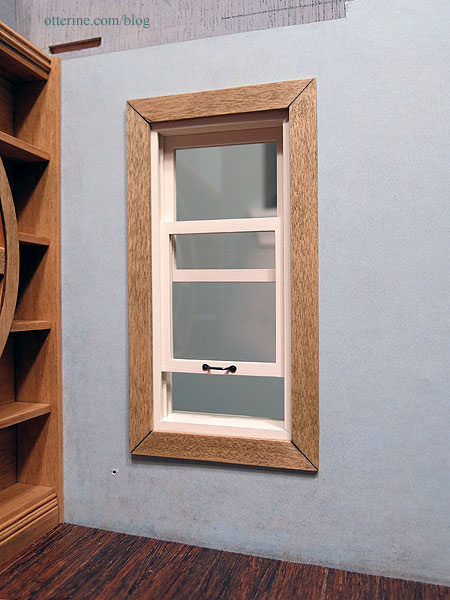 The window I bought from Hobby Lobby would not go back together correctly, even though I was careful to keep the parts in the right order. I won’t put a wonky window in a build I’ve been so carefully planning. I painted a Houseworks window in replacement, using stained trim for the interior. The corner joins are somewhat pronounced from the stain, but it won’t matter with the window coverings and furniture placement.