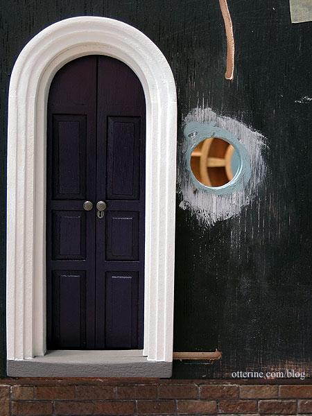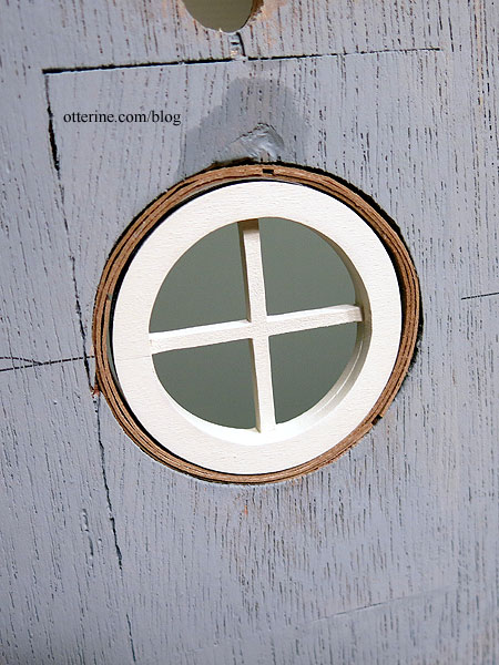 As noted previously, I had to repair the window opening for the round upper window due to a wandering Dremel. I cut strips of cardboard and lined the hole until I had a suitable diameter to hold the window in place. This fix will be covered by wallpaper on the interior and wood shingles on the exterior.